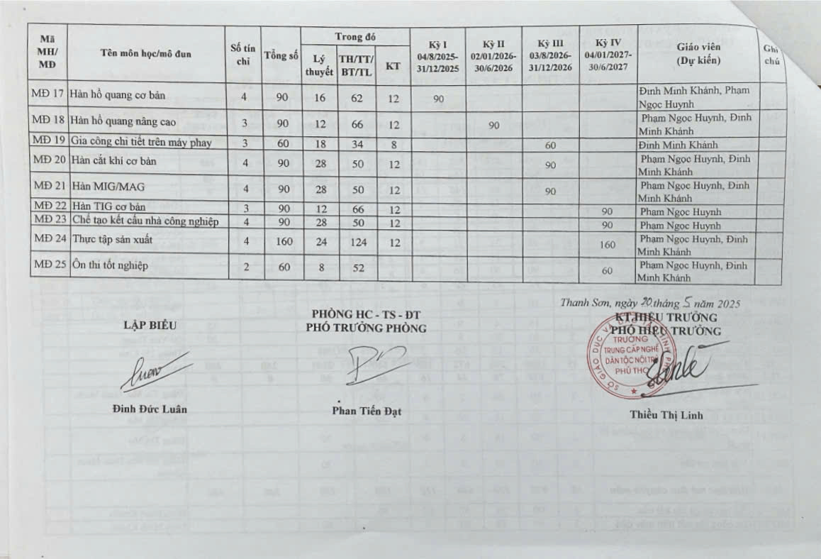 KẾ HOẠCH ĐÀO TẠO LỚP TRUNG CẤP ĐIỆN CÔNG NGHIỆP - KHÓA 15 (NIÊN KHÓA 2025-2027)