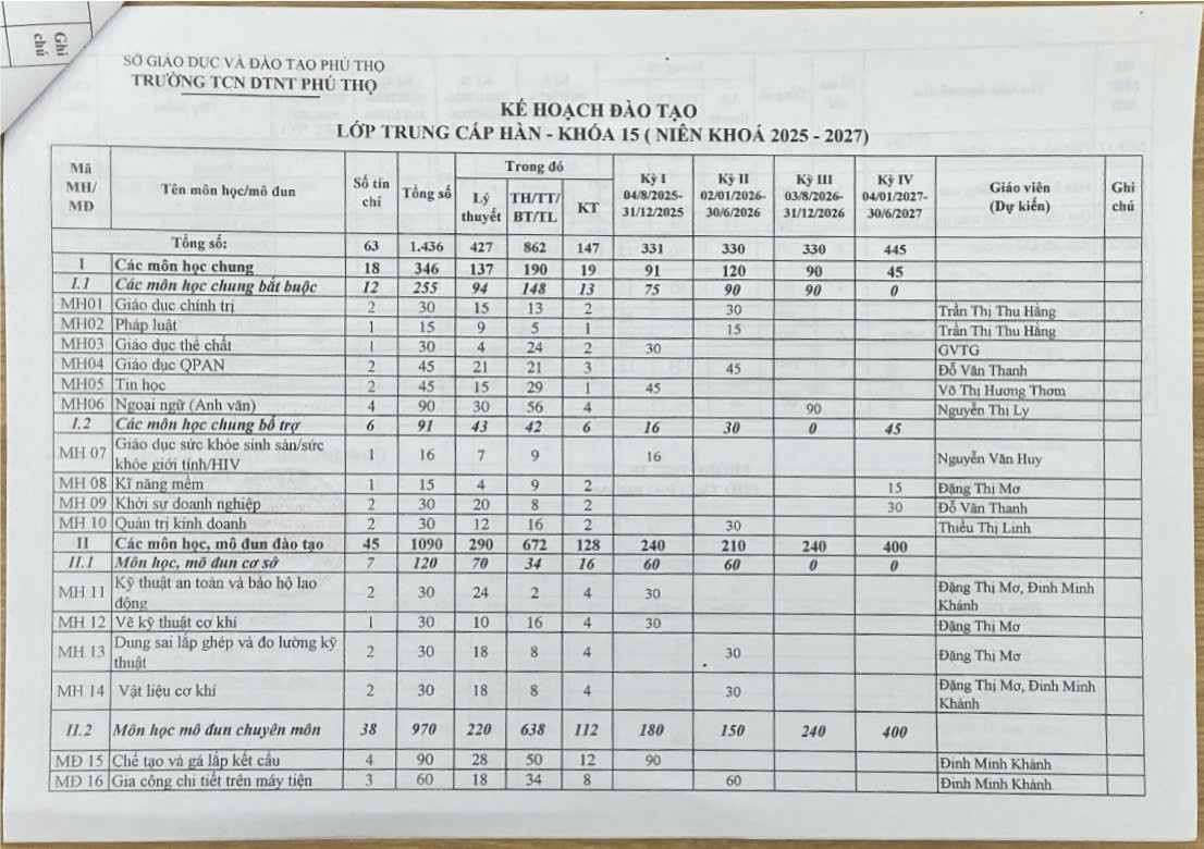 KẾ HOẠCH ĐÀO TẠO LỚP TRUNG CẤP HÀN - KHÓA 15 (NIÊN KHÓA 2025 - 2027)