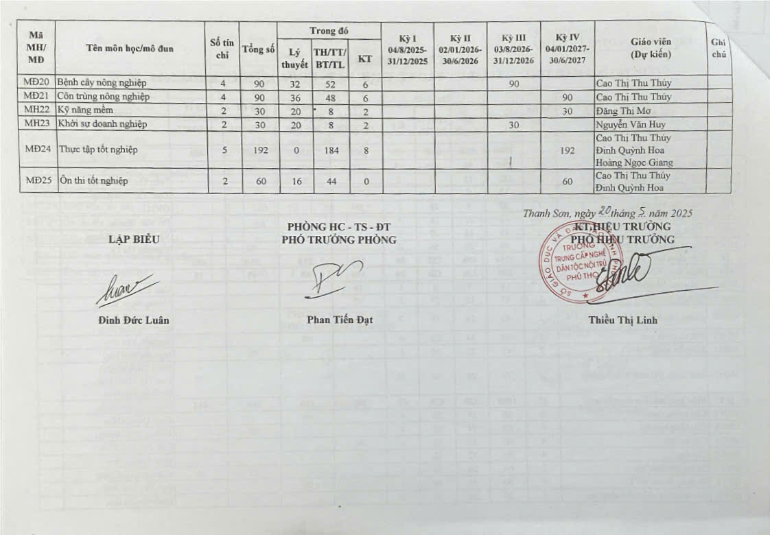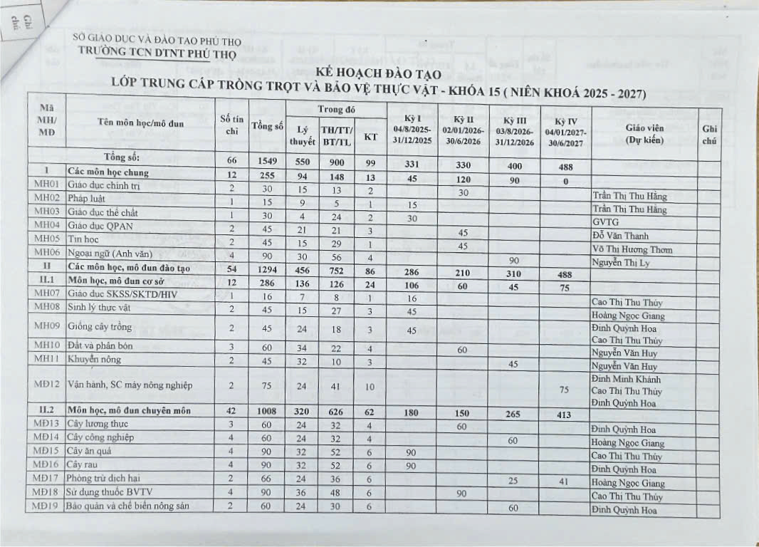 KẾ HOẠCH ĐÀO TẠO LỚP TRUNG CẤP TRỒNG TRỌT VÀ BẢO VỆ THỰC VẬT - KHÓA 15 (NIÊN KHÓA 2025 - 2027)